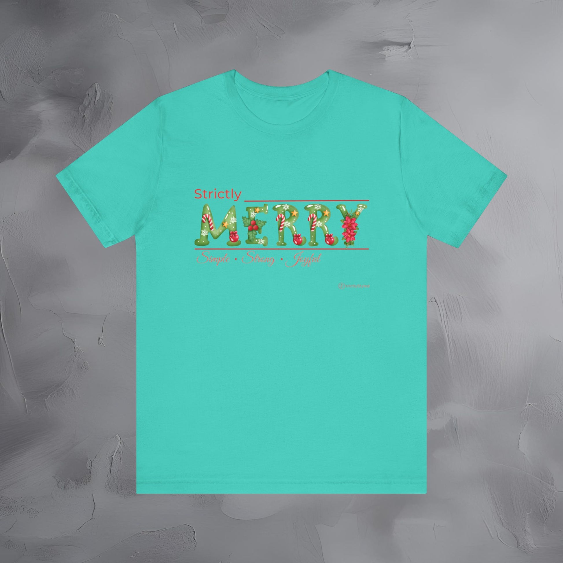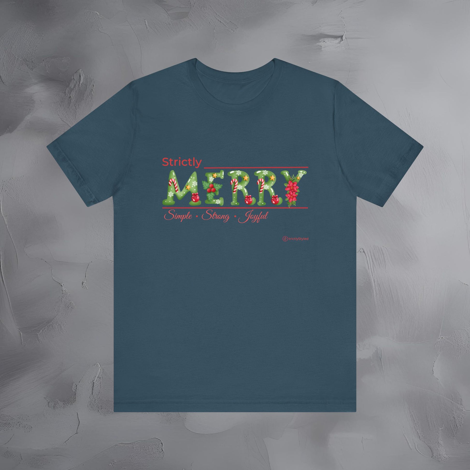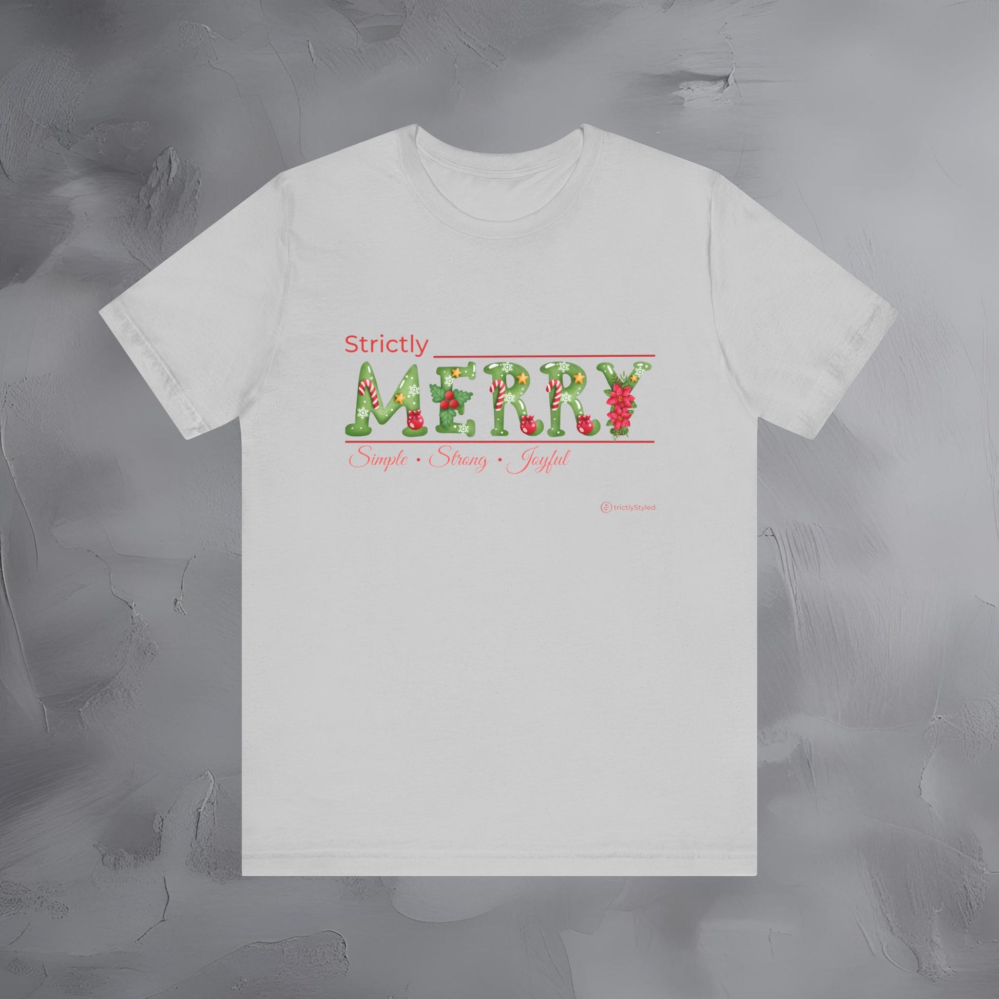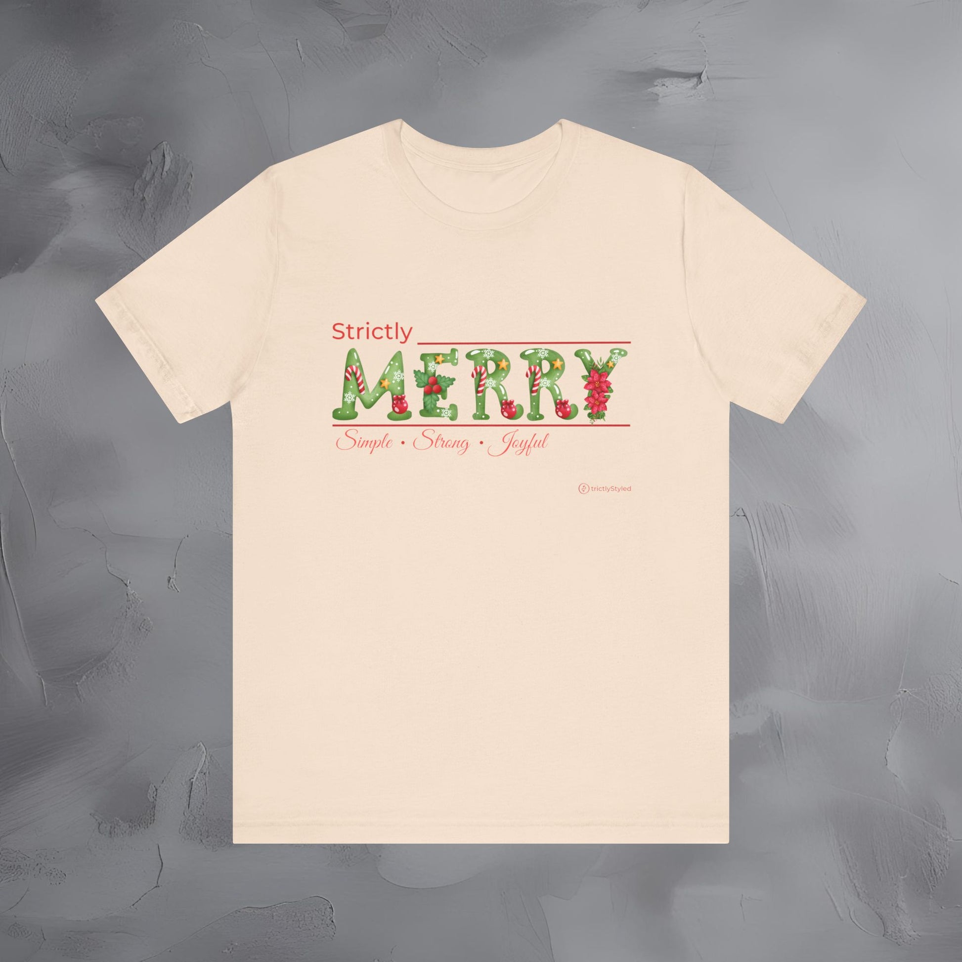 The Strictly Merry – Simple • Strong • Joyful tee brings a refreshing, modern approach to Christmas style — focusing on the qualities that make the season meaningful rather than on loud graphics or clichés.