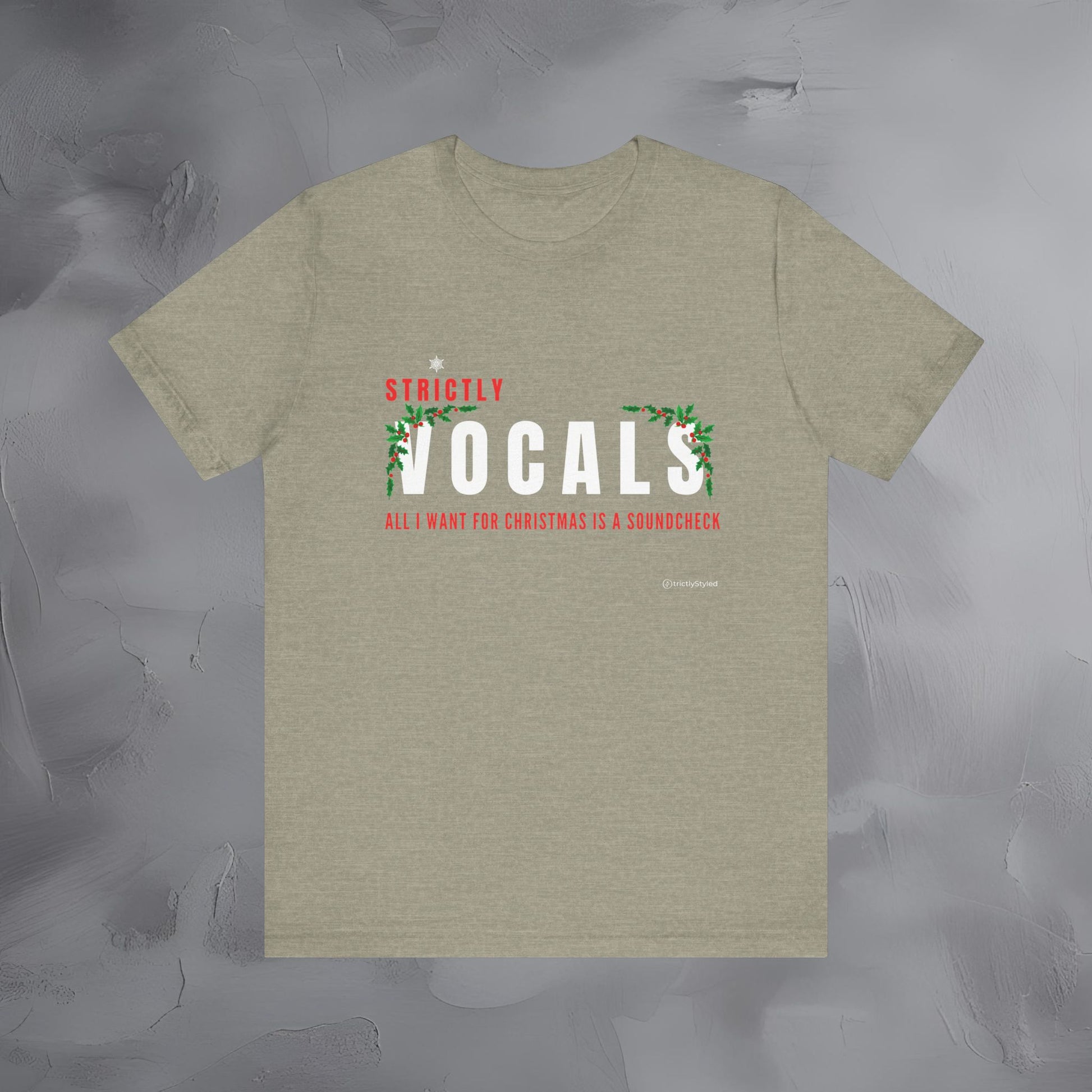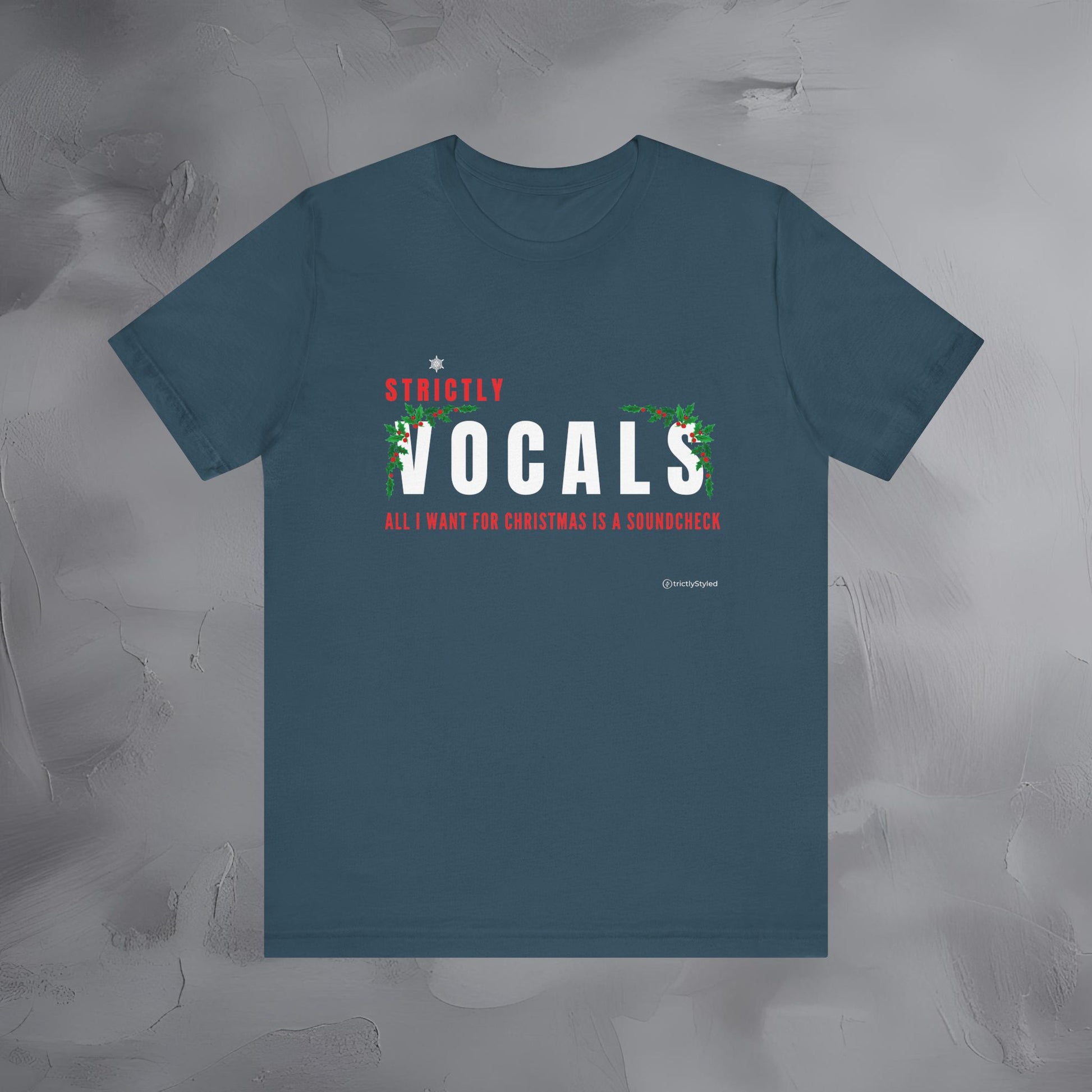 The Strictly Vocals – All I Want for Christmas Is a Soundcheck tee brings holiday humor to the stage with a clean, modern Strictly layout created just for singers.